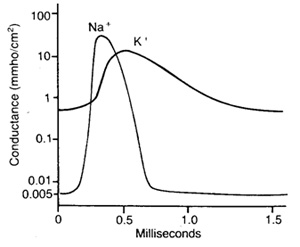 Рис. 3. Изменение проницаемости мембраны для ионов натрия и калия во время потенциала действия