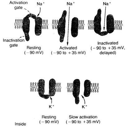 Основной механизм изменений проницаемости мембраны обусловлен событиями в натриевых и калиевых каналах мембраны. Состояние их ворот управляется величиной мембранного потенциала. Натриевые каналы имеют два типа ворот. Один из них, называемые активационными воротами закрыты в состоянии покоя и открываются при деполяризации мембраны. Поступление ионов натрия в клетку вызывает открытие всё большего числа активационных ворот. Второй тип ворот натриевых каналов - инактивационные при усиливающейся деполяризации мембраны постепенно закрываются, что останавливает приток натрия в клетку. Деполяризация мембраны также служит причиной открытия дополнительного числа калиевых каналов, в результате чего увеличивается проницаемость мембраны для ионов калия и происходит реполяризация мембраны.