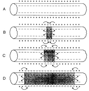 Потенциал действия распространяется вдоль мембраны нервной и мышечной клеток без уменьшения амплитуды с расстоянием. Этот процесс обусловлен кабельными свойствами плазматической мембраны, т.е. способностью проводить электрический ток на небольшие расстояния. Локальный электрический ток течет в клетку в активной области (где возникает потенциал действия) и из клетки - в смежной неактивной зоне. Эти ионные токи вызывают некоторые изменения мембранного потенциала в зоне, прилегающей к месту возникновения потенциала действия.