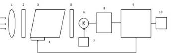 Принцип работы устройства следующий. Электромагнитное излучение от исследуемого объекта проходит через входную оптику 1 и поляризатор 2 и попадает на акустооптическую ячейку 3, работающую как светофильтр способный перестраиваться в зависимости от частоты ультразвука на пьезоэлементе 4. Здесь происходит дифракция излучения, далее продифрагированный луч пройдя через анализатор 5 попадает на фоточувствительный элемент 6. Для снижения тепловых шумов и увеличения чувствительности на фотоэлементе установлен элемент Пельтье 7. Далее фототок проходит через блок подготовки сигнала 8, который представляет из себя схему усиления и преобразователя ток-напряжение. Сигнал обрабатывается микроконтроллером 9 в цифровом формате. Так же микроконтроллер организовывает управление акустооптической ячейкой путем программной генерации заданной частоты ультразвука и передает результаты измерения по интерфейсу связи 10.