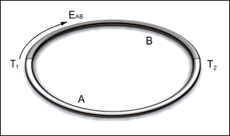 Этот факт послужил основой для создания устройства, чувствительным элементом которого является термопара — два проводника из разнородных материалов, соединенных между собой на одном (рабочем) конце, другие два (свободные) конца проводников подключаются в измерительную цепь или непосредственно к измерительному прибору, причем температура свободных концов заранее известна. Термопара образует устройство (или его часть), использующее термоэлектрический эффект для измерения температуры. Под термоэлектрическим эффектом понимается генерирование термоэлектродвижущей силы (термоЭДС), возникающей из-за разности температур между двумя соединениями различных металлов и сплавов (рис. 1), образующих часть одной и той же цепи.