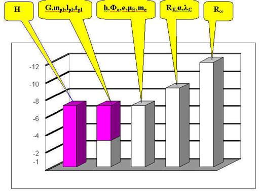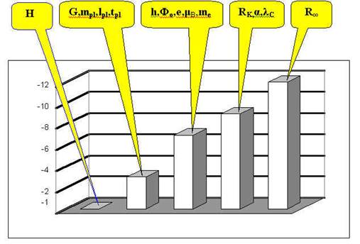 Рекомендуемые значения фундаментальных физических констант очень сильно отличаются по точности [2]. Так, например, расхождение по точности у гравитационной константы G и константы Ридберга Roo составляет огромную величину - около 108 . А параметр Хаббла почти на 12 порядков хуже по точности постоянной Ридберга. На рис.2, на примере наиболее распространенных констант G, mpl , lpl , tpl , H, h, Фо , e, B , me , RK , , , C , Roo , представлены сравнительные диаграммы, отображающие точность , с которой определены значения этих констант.
