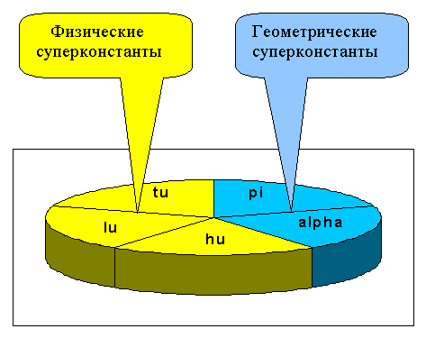Размерные суперконстанты hu , lu , tu определяют физические свойства вакуума и являются константами фундаментального состояния материи [3 - 8]. Суперконстанты π и α определяют геометрические свойства пространства-времени. Суммой геомет рических(π , α ) и физических(hu , lu , tu ) супер констант представлен онтологический базис фундаментальных физических констант (Рис.1).