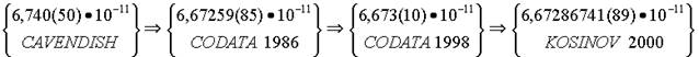 | Kosinov, 2000 | G = l u 3 /t u 2 me D o | 6,67286741(91)• 10-11 m3 kg-1 s-2 |