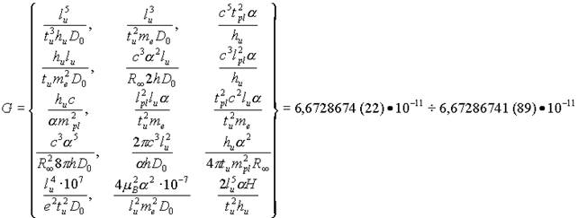 | Kosinov, 2000 | G = l pl 2 lu α/tu 2 me | 6,6728674(11)• 10-11 m3 kg-1 s-2 |