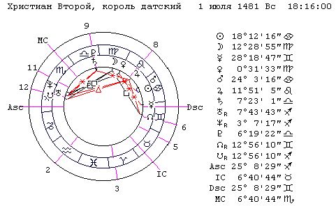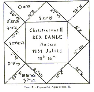 Дальнейший анализ гороскопа по [11, стр. 143]: "Наш гороскоп показывает, что между Меркурием и Марсом имеется угол 54 гр. Властитель рождения, Меркурий, должен таким образом быть направляем углом 54 гр., чтобы образовывать многозначительное сочетание с несущим несчастие Марсом, который угрожает рождённому тюрьмою... так как астрологи считают градус за год, то мы узнаём, что Христиану II это несчастье грозит через 50 и ещё несколько лет после рождения. Действительно, ему был 51 год, когда он был заключён в Зондербург (на Альсене). Однако вычисления астрологов не всегда попадают так в цель..."