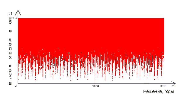 Глядя на систему, можно сразу сказать следующее: переменная D является общей для всех неравенств системы, и поэтому логично начинать перебор именно по ней. Сделаем так: в цикле по возрастанию для D будем решать каждое из неравенств, после чего сформируем общее решение и запомним его. Находить решение каждого неравенства будем, зная, что величина Е меньше единицы (и даже половины). Можно округлять выражение D*Vx до ближайшего целого, которое примем за Nx. Найдем после этого Е как модуль разности D*Vx-Nx. После того как найдем решения каждого отдельного неравенства, найдем общий орб, как наибольший из орбов для всех неравенств. Полученное решение станем запоминать, если орб системы окажется меньше заранее заданного максимума. Таким образом, мы получим общую картину решений, которую можно отразить графически - см. следующий рисунок, или таблично. Вот что выходит, если отложить годы, соответствующие решениям D системы по горизонтальной оси, а соответствующие орбы - по вертикали: