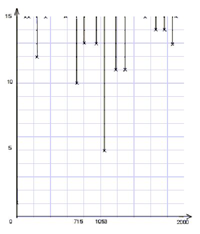 Конечно, этот рисунок не претендует на на отчётливость демонстрации, в первую очередь из-за сложности отображения большого множества решений, но он может проиллюстрировать некоторые выводы. Например, мы видим, что при орбе порядка 100 градусов любые дни являются решениями системы. Так же отчетливо видно, что наилучшим решением являются 1053 года (полная таблица ниже). Увеличим нижнюю часть рисунка, соответствующую решениям системы при малых орбах. Наиболее разумно ограничиться 15 градусами, поскольку такой орб бывает при разбросе в один знак Зодиака. Крестик отмечает наилучшего представителя в своей вертикальной полосе решений: