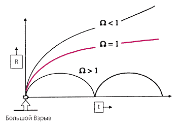 где R — радиус Вселенной на момент времени t, и может зависеть от времени. Современное значение постоянной Хаббла обозначают H 0 . Поскольку она экспериментально еще не определена с достаточной точностью, ее обычно записывают как H 0 º 100h ·км·с–1 ×Мпк–1 , где h ~ 0.65. А как она меняется во времени, т.е. как протекает процесс расширения, зависит от общей массы Вселенной [2].
