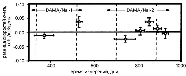 Предсказываемая величина сезонного изменения всего »5%, так что обнаружить эффект нелегко, тем более он в значительной степени может быть затенен сезонными вариациями собственного фона детектора за счет различных внешних факторов. Тем не менее недавно коллаборация DAMA [12] декларировала обнаружение годовых модуляций WIMPs, которые интерпретируются как результат упругого рассеяния нейтралино с массой около 60 ГэВ и сечением порядка 7·10–42