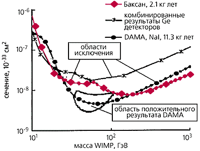 Ge и природного Ge. Получены новые области исключения (т.е. значения параметров, лежащие выше приведенных кривых, экспериментально исключаются из числа возможных) для масс и сечений упругого рассеяния WIMPs, которые почти вплотную подошли к требующим подтверждения результатам коллаборации DAMA (рис. 8).