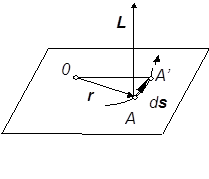 где ds - вектор перемещения материальной точки за время dt. Величина векторного прои зв едешь двух векторов геометрически представляет собой лощадь построенного на них параллелограмма. Площадь же параллелограмма, построенного на векторах ds и r , есть удвоенная площадь бесконечно узкого сектора OAA’ , описанного радиусом-вектором дви жущейся точки за время dt . Обозначив эту площадь через dS, можно записать величи ну момента в виде