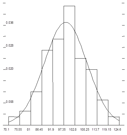 По построенной гистограмме (рис. 3.1) можно предположить, что данное распределение подчиняется нормальному закону. Для подтверждения выдвинутой гипотезы проведем оценку неизвестных параметров, для мат. ожидания