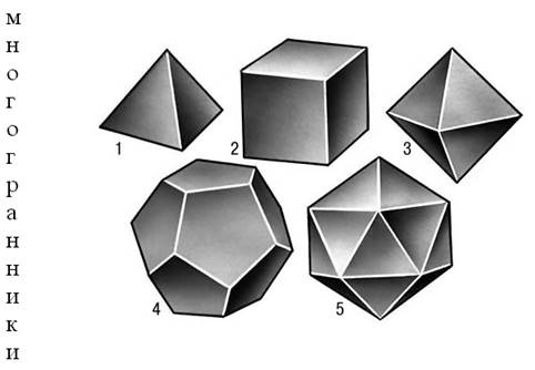Рисунки: 1-Тетраэдр, 2-Куб, 3-Октаэдр, 4-Додекаэдр, 5-Икосаэдр.