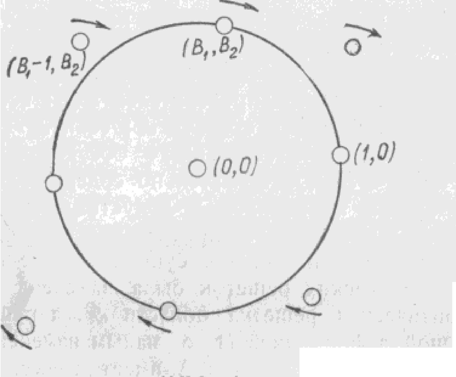 Наконец, если бы Λс имела бы только две пары точек ±(1, 0), ± (В1, В2) на границе, то решетку можно было бы слегка деформировать так, чтобы точка (1, 0) осталась на месте, а точка с координатами (В1, В2) продвинулась бы вдоль окружности Х12 + Х22 = 1 ближе к оси Х1. Наглядно это представлено на рисунке: