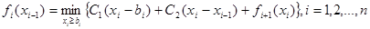 Если xi – количество работающих на протяжении i-й недели, то возможны затраты двух видов: 1) С1 (xi - bi )-затраты, связанные с необходимостью содержать избыток xi - bi рабочей силы и 2) С2 (xi - xi -1 )-затраты, связанные с необходимостью дополнительного найма (xi - xi -1 ) рабочих.