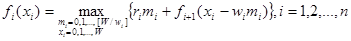 Если отбросить требования целочисленности ki , то решение задачи нетрудно найти с помощью симплекс-метода (см. Приложение В). В самом деле, так как остается лишь одно ограничение, базисной будет только одна переменная, и задача сводится к выбору типа і, для которого величина vi W/wi принимает максимальное значение. Исходная задача не является задачей линейного программирования, и для ее решения необходимо использовать метод динамического программирования. Следует отметить, что рассматриваемая задача может быть также решена с помощью методов целочисленного программирования.