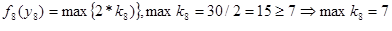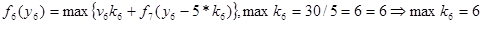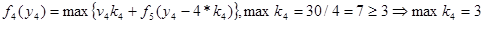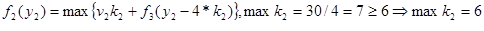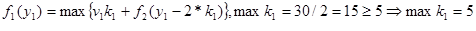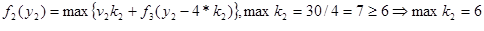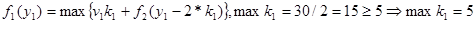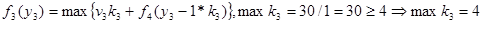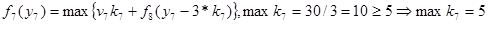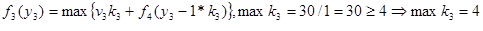 Оптимальное решение определяется теперь следующим образом. Из условия W=30 следует, что первый этап решения задачи при y1 =30 дает оптимальное решение k1 =0, которое означает, что на 0 (нуль) вопросов 1-го типа будут даны ответы. Далее находим: