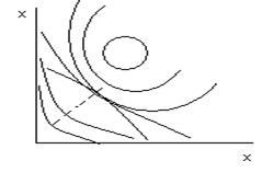 Если Х = (х1, х2) – точка плотности, х1и х2– её координаты, то задаче можно придать следующую форму. Пусть f(Х) — высота точки Х над уровнем моря, а уравнение g(X) = 0 описывает дорогу. Тогда наивысшая точка дороги - решение задачи (3).
