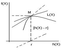 Функция L(X; l) получила название функции Лагранжа (или лагранжиана ) задачи (3), а коэффициент l — множителя Лагранжа .