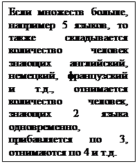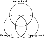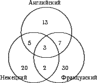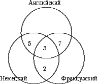 Решение: Выразим условие этой задачи графически. Обозначим кругом тех, кто знает английский, другим кругом - тех, кто знает французский, и третьим кругом - тех, кто знают немецкий.