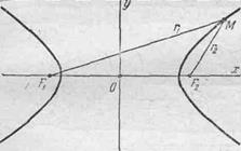 Пусть дана какая-нибудь гипербола с фокусами F1 и F2 . Возьмем на плоскости произвольную точку М и обозначим ее координаты через х и у, а фокальные радиусы F1 М и F2 М через r1 и r 2 . Точка М будет находиться на (данной) гиперболе в том и только в том случае, когда