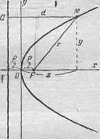 Пусть дана какая-нибудь парабола. Возьмем на плоскости произвольную точку М и обозначим ее координаты через х и у. Обозначим далее через r расстояние от точки М до фокуса ( r = FM ), через d — расстояние от точки М до директрисы. Точка М будет находиться на (данной) параболе в том и только в том случае, когда