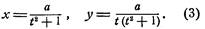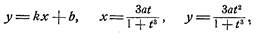 Иногда удобно пользоваться параметрическими уравнениями декартова листа, которые можно получить, полагая y = tx , присоединяя к этому равенству равенство (1) и решая полученную систему относительно х и у, в результате будем иметь: