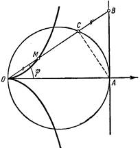 1. Особенности формы. Среди многих способов образования циссоиды— кривой, открытой древними в поисках решения знаменитой задачи об удвоении куба, мы остановимся сначала на простейшем. Возьмем окружность (называемую производящей) с диаметром ОА=2а и касательную АВ к ней. Через точку О проведем луч ОВ и на нем отложим отрезок ОМ=ВС. Построенная таким образом точка М принадлежит циссоиде. Повернув луч 0В на некоторый угол и проделав указанное построение, мы найдем вторую точку циссоиды, и т. д. (Рис. 3).