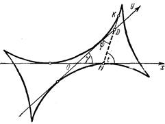 3. Косая астроида. Обобщением рассмотренной астроиды является так называемая косая астроида, которая представляет собой огибающую отрезка ND постоянной длины R, скользящего своими концами по двум прямым, пересекающимся под произвольным углом f.