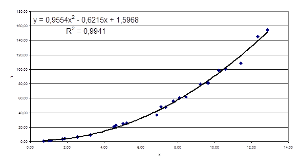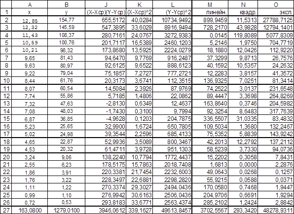 1. Анализ результатов расчетов показывает, что квадратичная аппроксимация наилучшим образом описывает экспериментальные данные т.к. согласно таблице 8 коэффициент корреляции - 0,9620; Коэффициенты детерминированности линейной аппроксимации - 0,9253; квадратической аппроксимации – 0,994; экспоненциальной аппроксимация – 0,0269.
