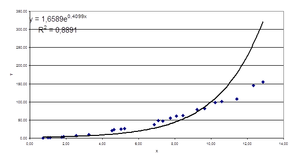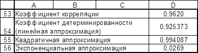 3. Полученное при построении линии тренда значение коэффициента детерминированности для экспоненциальной зависимости не совпадает с истинным значением поскольку при вычислении коэффициента детерминированности используются не истинные значения y, а преобразованные значения ln(y) с дальнейшей линеаризацией.