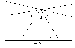 . Но так как в геометрии Лобачевского параллельность сохраняется только в одном направлении, то для нахождения суммы углов треугольника*, то нужно провести две прямые, параллельные данной в разные стороны. Что получается, видно на рисунке 3. Понятно, что теперь сумма углов треугольника меньше 180о