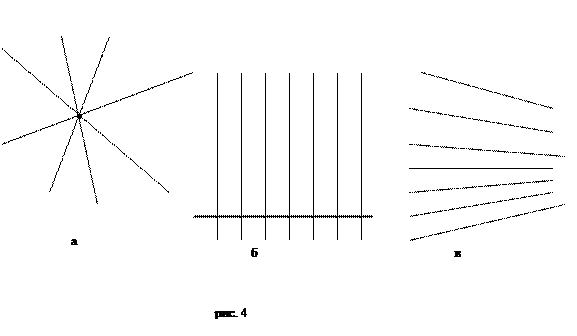 Так вот, первый вид пучков образован прямыми, имеющими общую точку – центр пучка (рис. 4а). Пучок расходящихся прямых – это перпендикуляры к одной прямой – оси пучка (рис. 4б). Из этого определения выходит интересное и, казалось бы, абсурдное утверждение, что два перпендикуляра к одной прямой непараллельны, и отличие от геометрии Евклида.