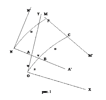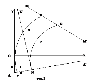 (3). Отложим теперь отрезок ОА = u и проведем прямую АА’, параллельную ОХ, и прямую ММ’, параллельную ОХ и ОY. Строим прямую NN’, перпендикулярную АА’ и параллельную ОY (рис. 2). Через точку О проведем ортогонально к ОХ предельную дугу