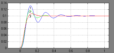 На Рис 3.7 приведена реакция системы при различных значениях i (цифрами обозначены: 1 - i =10-2; 2 - i =10-3; 3 - i =10-4;). Динамика изменения угла поворота при варьировании параметра i практически не изменяется. Из эксперимента видно, что коэффициент передачи редуктора i природным образом влияет на динамику системы, и ,что увеличение коэффициента приводит к увеличению максимальной амплитуды угловой скорости.