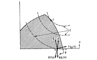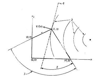 Рис. 9. Использование поч ти активных ограничений. 1 — опти мальное решение; 2— линии уровня целевой функции; 3—1-е ограничение; 4— 2-е ограничение.