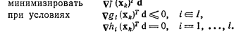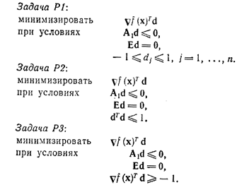 Задачи Р1 и РЗ являют ся задачами линейного программирования и, следовательно, могут быть решены симплекс-методом. Задача Р2 содержит квадратичное ограничение, но может быть рассмотрена в несколько упрощенном виде. Так как d = 0 является допустимой точкой в каждой из приведенных выше задач и так как значение целевой функции в этой точке равно нулю, то ее оптимальное значение в задачах Р1, Р2 и РЗ не может быть положительным. Если минимальное значение целевой функции в задачах Р1, Р2 или РЗ отрицательно, то по лемме построено возможное направление спуска. С другой стороны, если минимальное значение целевой функции равно нулю, то, как показано ниже, х является точкой Куна — Таккера.