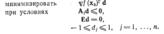Пусть задана допустимая точка х. Как показано в лемме , ненулевой вектор и является возможным направлением спуска. Естественный подход к построению такого направления заключается в минимизации Ñf(х)T d. Заметим, однако, что если существует вектор d, такой, что Ñ f(х)T d <0, А 1 d£0, Еd= 0, то оптимальное значение целевой функции в сформулированной задаче равно — ¥, так как ограничениям этой задачи удовлетворяет любой вектор l d, где l—сколь угодно большое число. Таким образом, в задачу должно быть включено условие, которое ограничивало бы вектор и или оптимальное значение целевой функции. Такое ограничени е обычно называют нормирующим. Ниже приведены три задачи построения