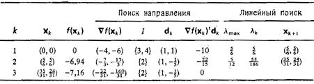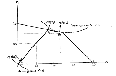 Линейный поиск. Можно легко проверить, что мак симальное l, при котором точка x2 +ld2 допустима, равно lmax == 0.3472. При этом активным становится ограничение . Значение l2 получается минимизацией при условии и, очевидно, равно l2 = 0.3472, так что хз = х 2 +l 2 d2 = (0.5555, 0.8889)T .