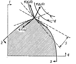 На рис. 6 показана совокупность возможных направлений спуска в точке х. Вектор d , удовлетворяющий равенству , является касательн ым к множеству в точке х. Поскольку функции gi нелинейны, движение вдоль такого вектора d может привести в недопустимую точку, что вынуждает нас тре бовать выполнения строгого неравенства .