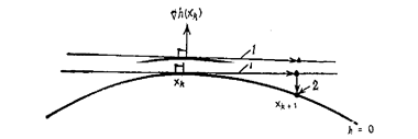 Рис. 8. Нелине йные ограничения-равенства. 1 —касательное н аправл ени е; 2 — корректирующее движение в допусти мую область.