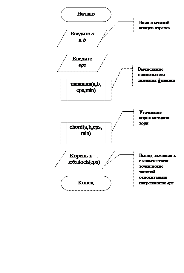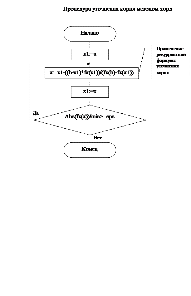 Пользуясь рекуррентной формулой (2) и формулой для оценки точности вычисления, составим процедуру уточнения корня методом хорд: