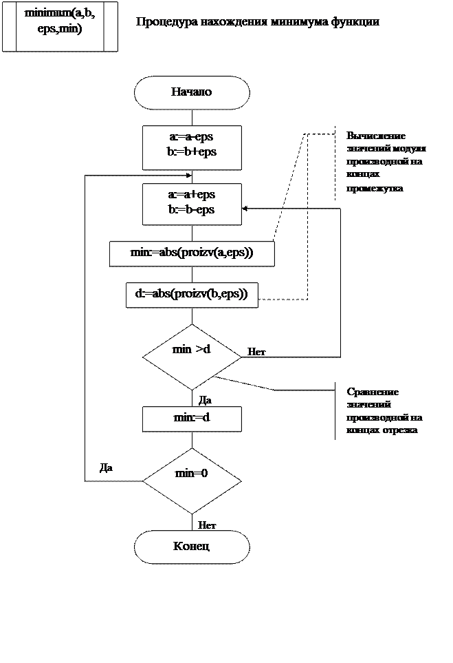 Здесь min:=abs(proizv(a,eps))- модуль значения производной функции в начале отрезка,