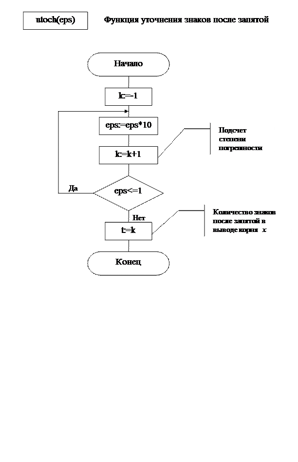 Здесь k:=k+1 – оператор, подсчитывающий степень погрешности и порядка корня x .