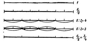 отрезок, составленный из 6 восьмых линейной единицы, можно рассматривать составленным из 3 четвертей той же единицы.