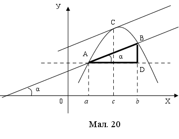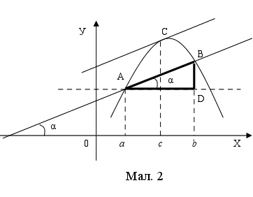 Геометричний зміст похідної: Похідна функції f(x) в точці х0 дорівнює тангенсу кута нахилу дотичної до кривої з додатним напрямом осі ОХ у точці з абсцисою х0.