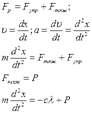Дифференциальное уравнение получим из второго закона Ньютона: F=ma, где m=P/g—масса груза а—ускорение движения и F—равнодей-ствующая приложенных к грузу сил. В данном случае равнодействующая слагается из силы натяжения пружины и силы тяжести.
