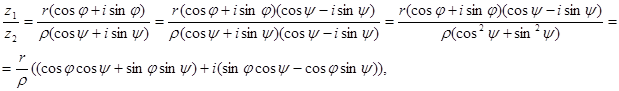 Формула (27) означает, что модуль частного равен модулю делимого, деленному на модуль делителя. Формула (28) показывает, что разность аргументов делимого и делителя является аргументом частного двух комплексных чисел.