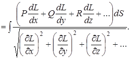 Открытие формулы преобразования тройного интеграла в двойной помогло Остроградскому решить проблему варьирования п- кратного интеграла, именно, вывести понадобившуюся там общую формулу преобразования интеграла от выражения типа дивергенции по п- мерной области и интеграл по ограничивающей ее сверхповерхности S с уравнением L(x,y,z,…)=0. Если придерживаться прежних обозначений, то формула имеет вид